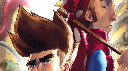 I’m delighted because I’ve got a soft spot for Lair of the Clockwork God. I reviewed it on PC in 2020 and loved it. It’s an adventure game and sometimes a platform game about two characters, Dan and Ben. And they bicker, endlessly. One represents point-and-clicks, and the other, platformers. And they don’t always get along.